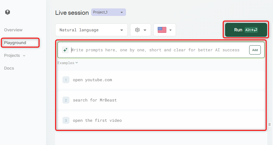 Once you go to Playground tab, ensure it’s set to Natual language. Choose a country, give it prompts to perform and hit the Run button.