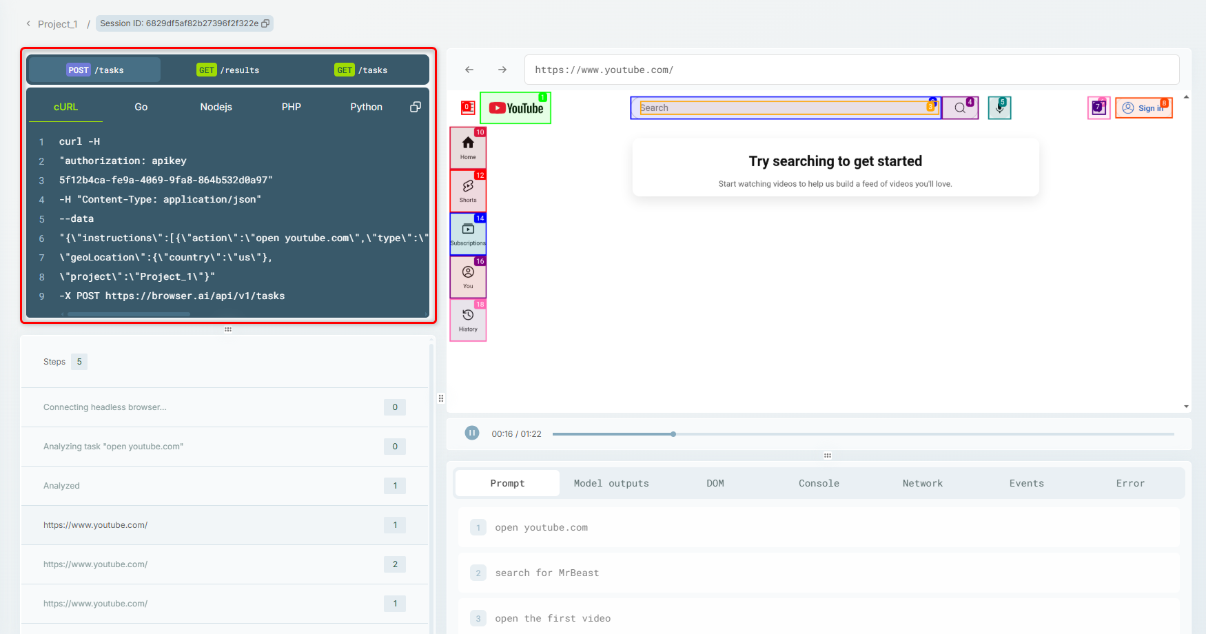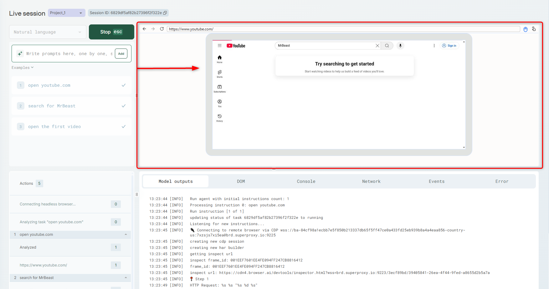 Use BrowserAI together with Crawler Automation as explained in the Task API. In addition, to visualize the actions of BrowserAI head to Playground tab. There you’ll be able to choose Natural Language, country and add prompts for BrowserAI to perform. Then you can watch how the actions are being done on your right window in live!1