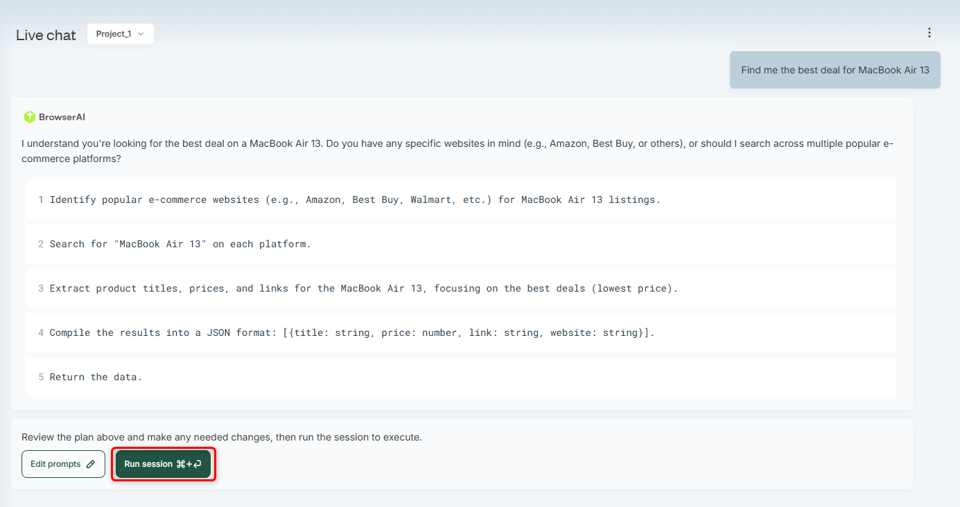 Be sure to clearly define the task you’re looking to accomplish — providing detailed information will help BrowserAI deliver the most precise and relevant results.