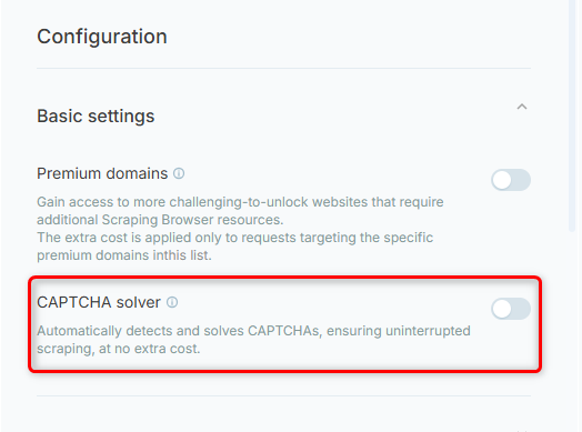 - Scroll down to Configuration -> Basic settings -> Captcha Solver.